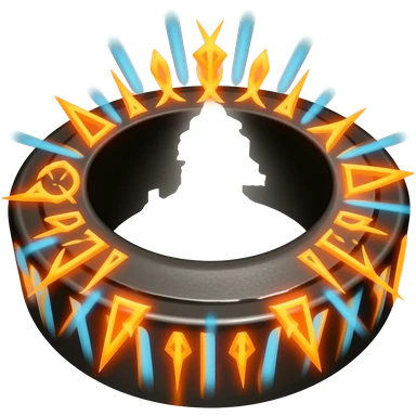 Black ring with glowing orange and blue runes emitting orange and grey emoji