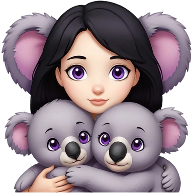 Emoji of a girl with purple eyes and black hairs hugging a stuffed koala emoji