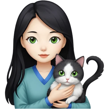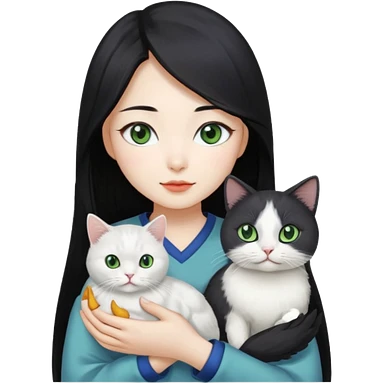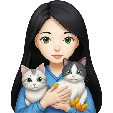 Black long hair, white skin, pretty black eyes, a woman with a gray Scottish fold green eye cat and a white blue eye cat emoji | AI Emoji Generator