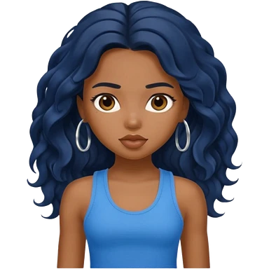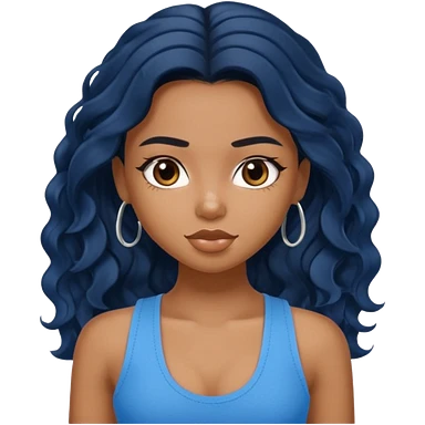 Black long wavy hair pretty white skin navy blue tank top girl blue eyes emoji | AI Emoji Generator