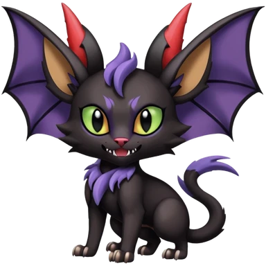 Black edgy Noivern-Noibat-Purloin-Torracat-Lykoi-Caracal-cat-Fakemon-fusion-hybrid-creature with bat head wings, big fangs, gothic markings emoji