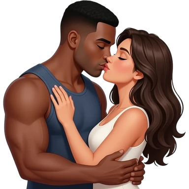 Black muscular man kissing Spanish woman with long hair hugging emoji