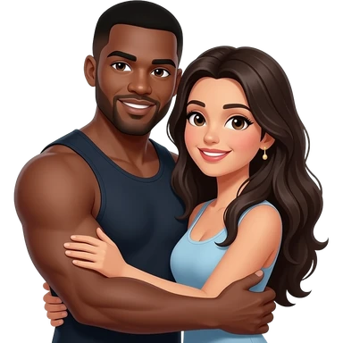 Black muscular man and Spanish woman with long hair hugging emoji