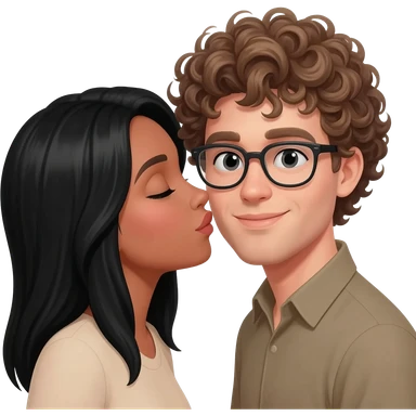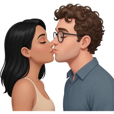 Light tan woman with black hair and man with curly dark blonde hair with glasses kissing emoji