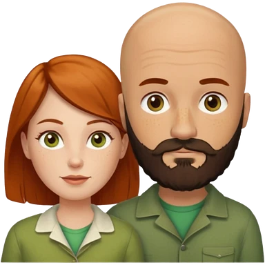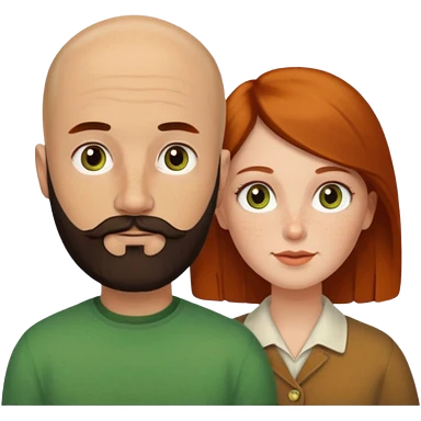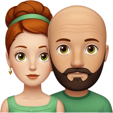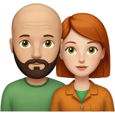 Couple. Bald man with dark brown-black beard. White woman with many small, faded freckles, she has white skin and she has auburn-yellow-brown-cinnamon, dark hair. She has light orange-brown eyes. The man have hazel eyes. They like green. Retro style. emoji