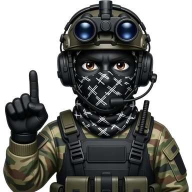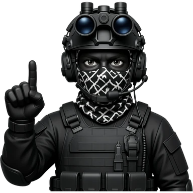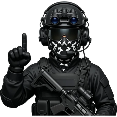 man wearing a black special tactics force outfit, face total painted black and a black and white patterned balaclava and wears a headset and a big black night vision device on his headtop FATIGUE AND COMBAT BOOTS PLATE with a helmet and a mask shows her middle fingers emoji