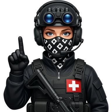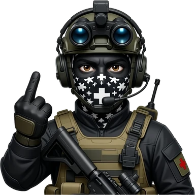 man wearing a black special tactics medical force outfit, face total painted black and a black and white patterned balaclava and wears a headset and a big black night vision device on his headtop FATIGUE AND COMBAT BOOTS PLATE with a helmet and a mask shows her middle fingers emoji