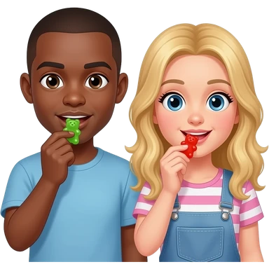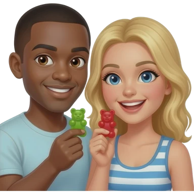 Black man with shaved head & blonde girlfriend eating gummy bears emoji