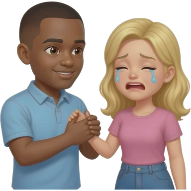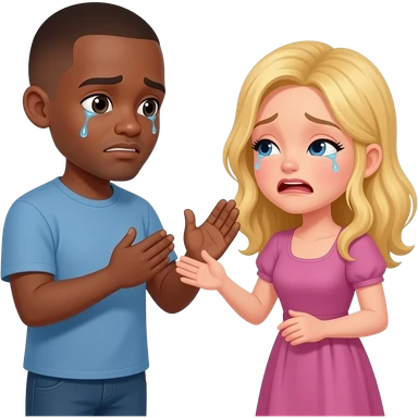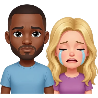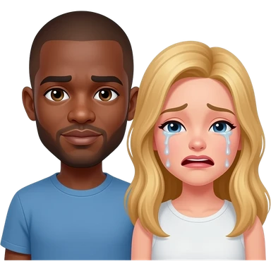 Black man with shaved head & blonde girlfriend crying together emoji