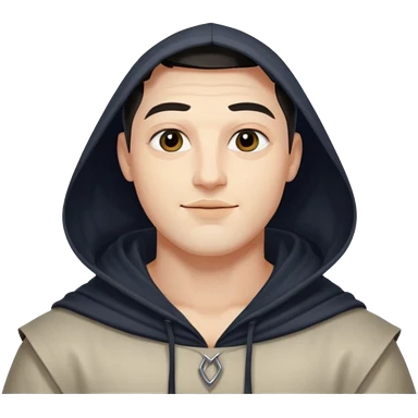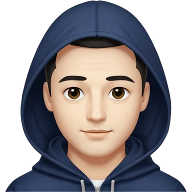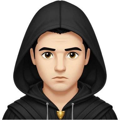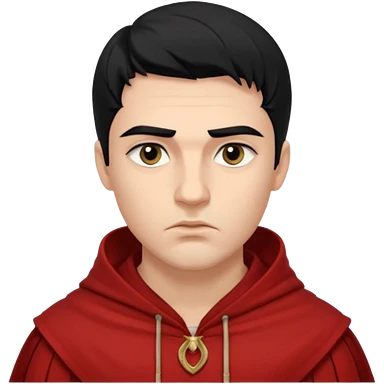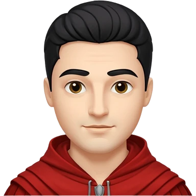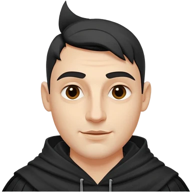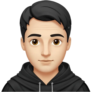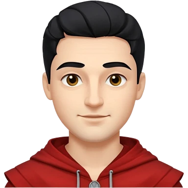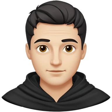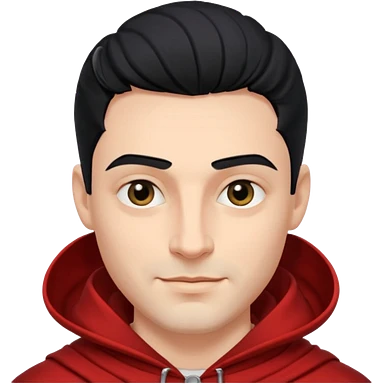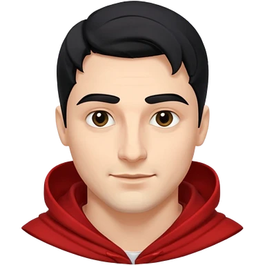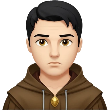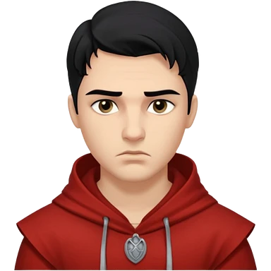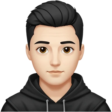 A handsome man with fair complexion. masculine, roman, slightly crooked nose. Thick triangular eyebrows. Hooded eyes and black pupils. pouty lips with a heavy top lid. thick black hair 80/20 part with an undercut. emoji