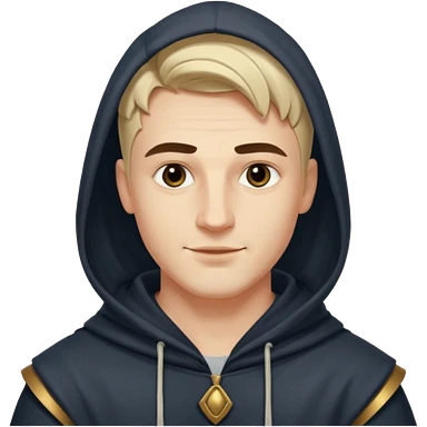 A young person with fair skin and soft facial features. The face is oval-shaped with a smooth complexion. The hair is medium brown, slightly tousled, and styled with a natural side-swept look, adding a bit of volume on top. Eyebrows are medium in thickness and naturally shaped. Eyes are medium-sized with a calm, neutral expression, and the eyelids are slightly heavy, contributing to a somewhat serious or relaxed demeanor. The nose is straight and proportionate to the face. The lips are medium in fullness with a subtle, closed-mouth expression. The jawline is soft and not sharply defined, adding to the youthful appearance. The person is wearing a black hoodie with visible silver grommets on the hood strings. Background suggests an indoor office or school setting with white walls and a ceiling with fluorescent lights emoji