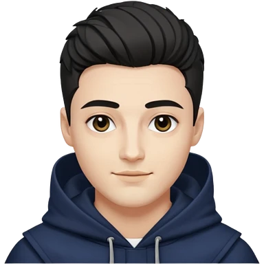 A handsome man with fair complexion. masculine, roman, slightly crooked nose. Thick triangular eyebrows. Hooded eyes and black pupils. smily lips with a heavy top lid. thick black hair 80/20 part with an undercut. emoji