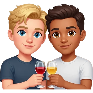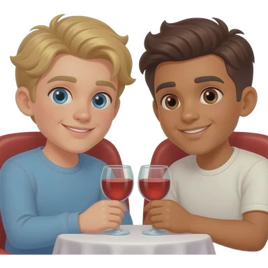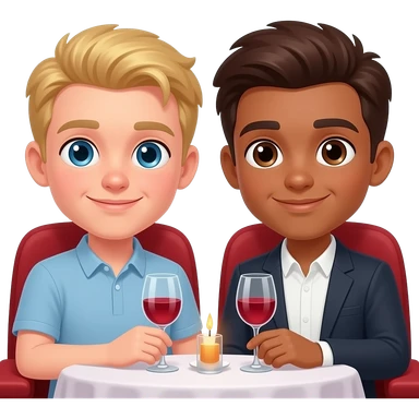 Make a young gay couple on a Date , one has light Skin with Blond Hair and Blue Eyes, the other one has slightly brown skin witz dark Brown Hair and Brown Eyes. They are in love. emoji