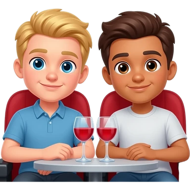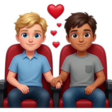 Make a young gay teen couple on a Date , one has light Skin with Blond Hair and Blue Eyes, the other one has slightly brown skin witz dark Brown Hair and Brown Eyes. They are watching a movie together. emoji