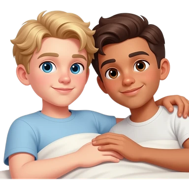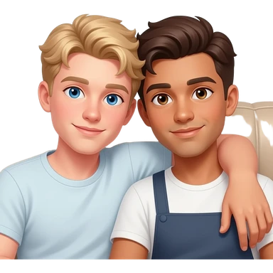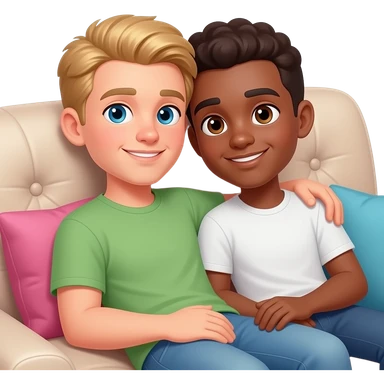 Make a young gay couple on a Date , one has light Skin with Blond Hair and Blue Eyes, the other one has slightly brown skin witz dark Brown Hair and Brown Eyes. They are laying romantic on a couch. emoji