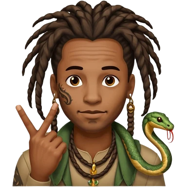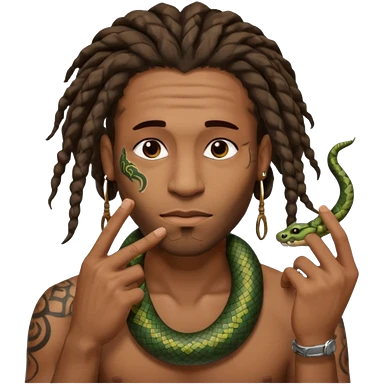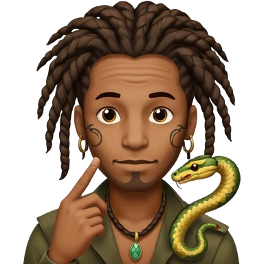 Black man with dreads and snake tattoo on forehead with index finger under his nose emoji