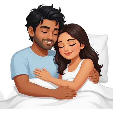Dark skin indian man with messy shortish black hair cuddling in bed with light skinned indian woman emoji