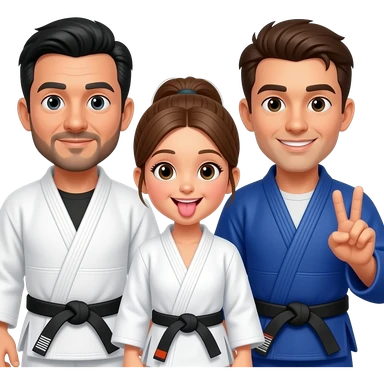 3 judo friends: one is a 40 years-old man with short black hair and a nice medium-short beard, in the middle a girl with brow-blondish hair in a pony tail who is sticking out her tongue, and on the right another 26 years-old guy with dark-brown hair who is making the peace sign with his hand emoji