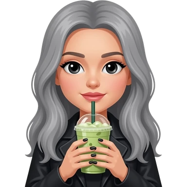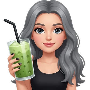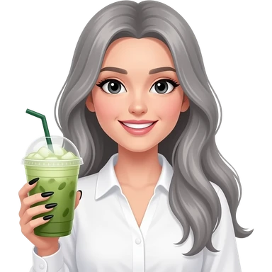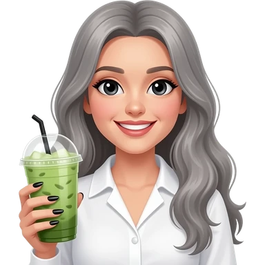 smiling lady with black eyes and grey very long hair, long black nails and holding a large iced matcha, wearing a white blouse emoji