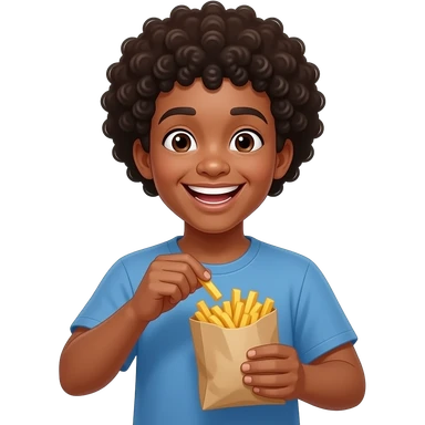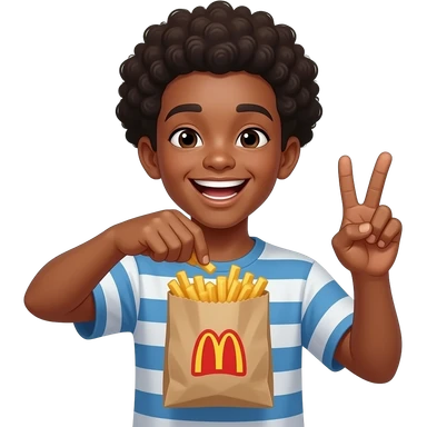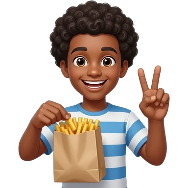 Black emoji teen with Afro laughing while holding the fries in the bag while holding peace sig emoji