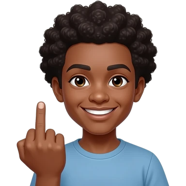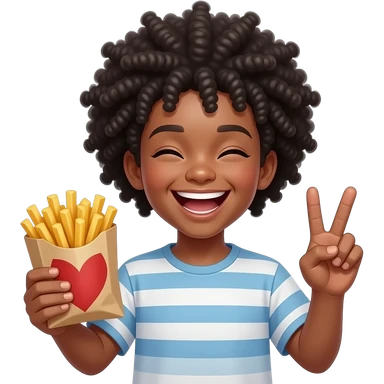 Black emoji teen with Afro laughing while putting the fries in the bag while holding peace sign emoji