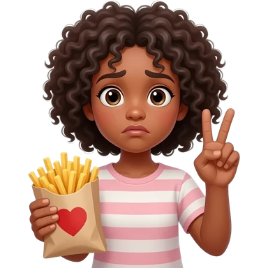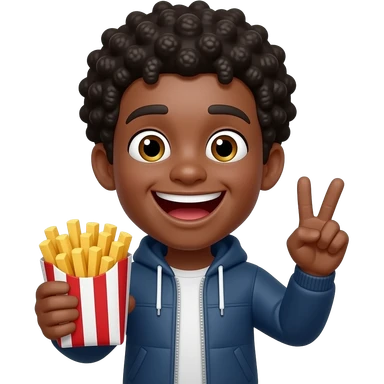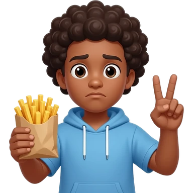 Black apple emoji teen with Afro confused while holding fries jn the bag , holding up peace sign emoji
