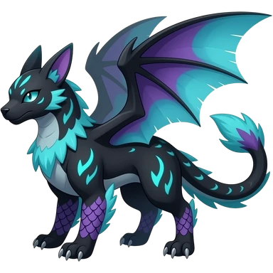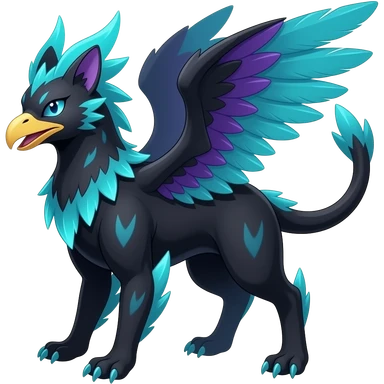 Black Dark Exotic Colorful Black, Cyan, Purple, Beaked Feathery Nocturnal Neon-glowing Abyssal Nightly Abyss-Cat-Gryphon-Salandit-Nargacuga-Silvally-Vernid-Sergal-Fakémon-Hybrid-Creature (full body) emoji