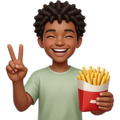 Black apple emoji teen with Afro laughing while holding the fries in the bag while holding peace sig emoji