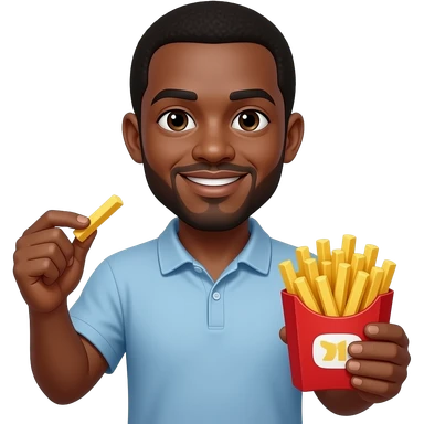 Black emoji Man putting the fries in the bag smiling , holding up the peace sign emoji