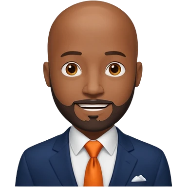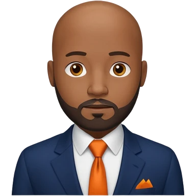 headshot of a sophisticated, stylish, bald head Caribbean black man with a beard and goatee in a navy blue suite, white shirt and dark orange tie with small eyes emoji