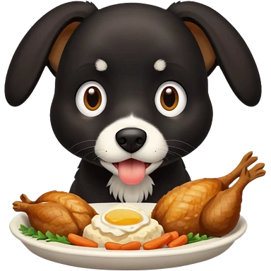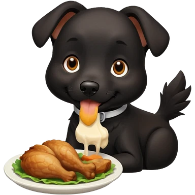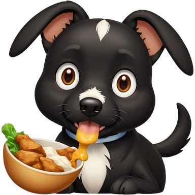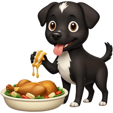 Can you create a black dog with a white stripe chasing it’s own tails and eating chicken emoji