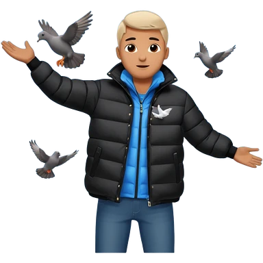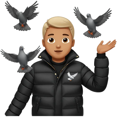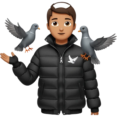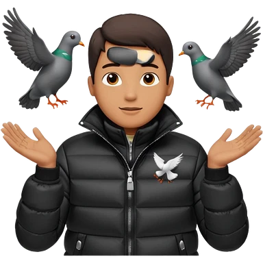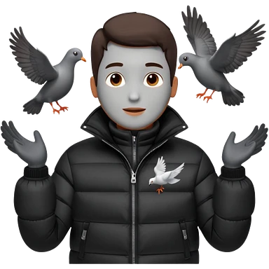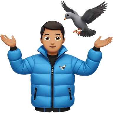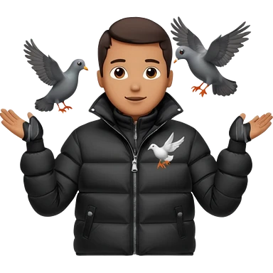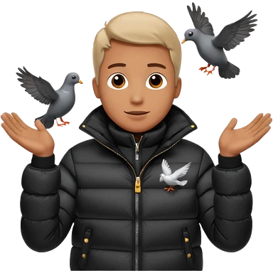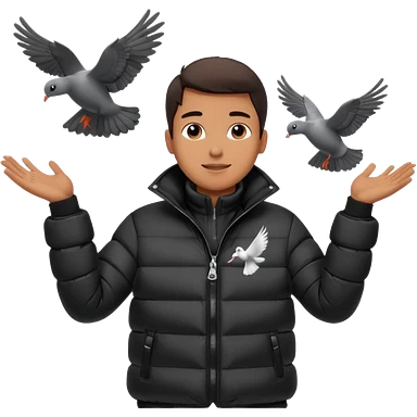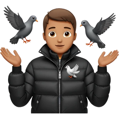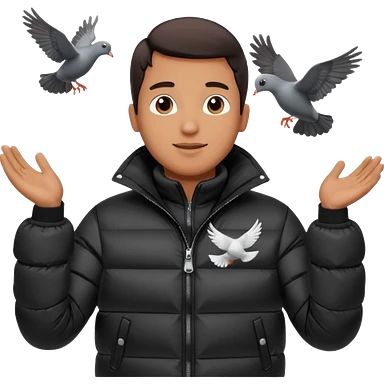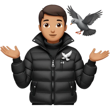 puffer shiny black jacket man open arms looking at a flying pigeon emoji