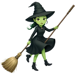 A green witch, like Elphaba in Wicked, wearing black and holding a broom stick emoji