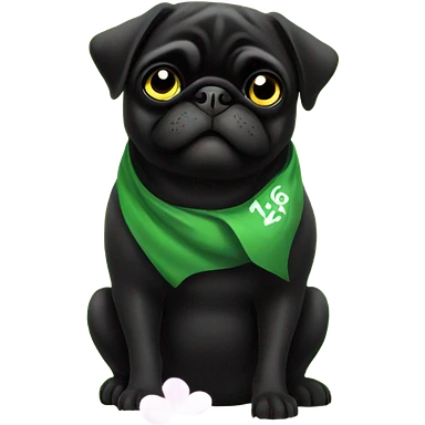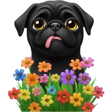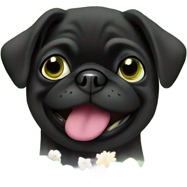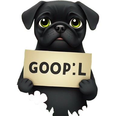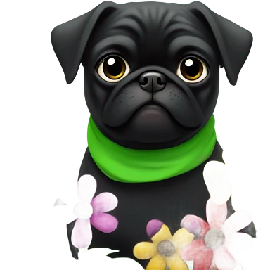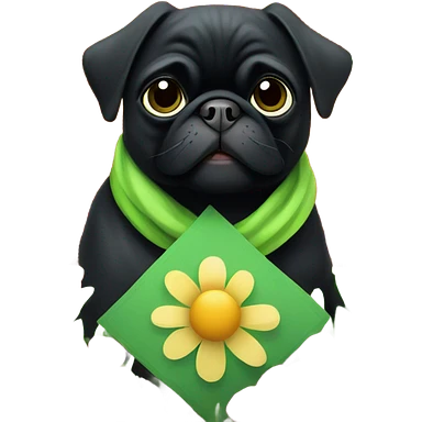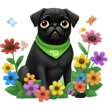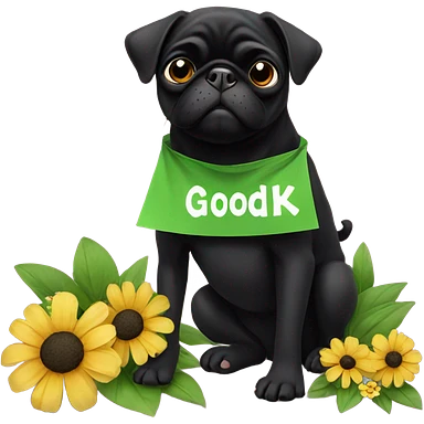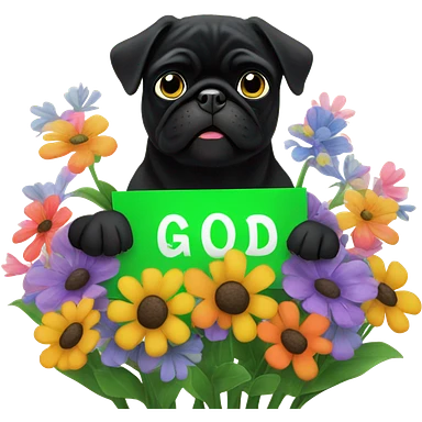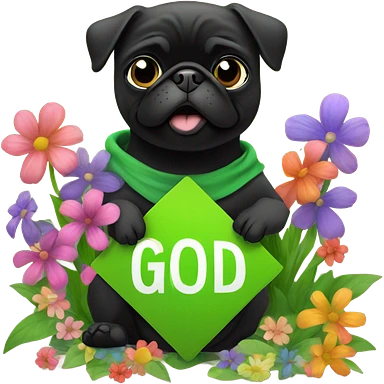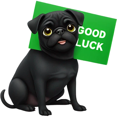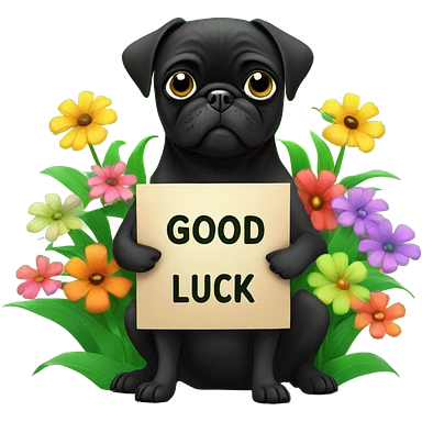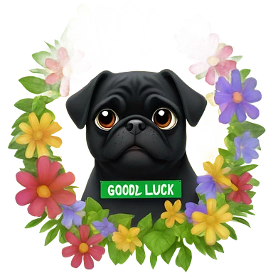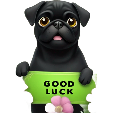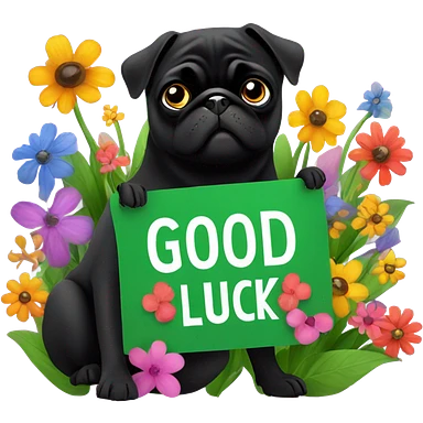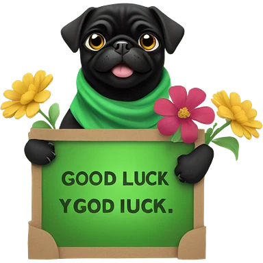 Black pug , surrounded by flowers, holding a green sign that says “good luck” emoji