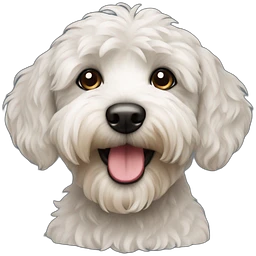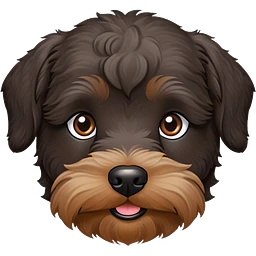 Black schnoodle with grey brindle and an underbite winking while smiling emoji