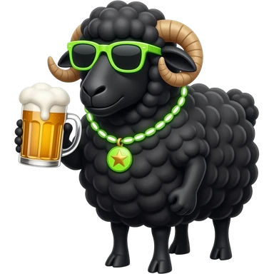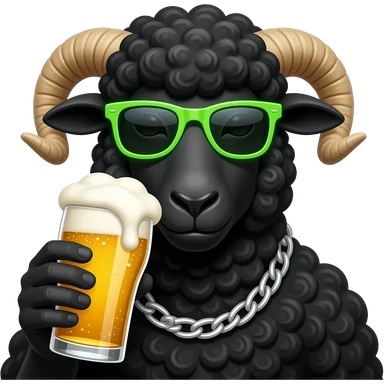 Black Sheep wearing neon sunglasses, necklace and drinking beer emoji