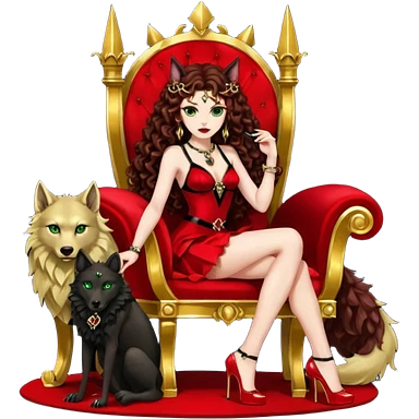 Lilith green eyes, symbol seductress evil brown curly long hair haired, sexy succubus woman with red and black Chanel dress on. A red and black stiletto platform high heel shoes on. sitting on a Black and gold throne. A large black fur wolf sitting beside her. Red rubies surround them both emoji