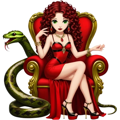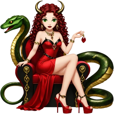 Lilith green eyes, symbol seductress evil brown curly long hair haired, sexy succubus woman with red and black Chanel dress on. A red and black stiletto platform high heel shoes on. sitting on a Black and gold throne. A giant snake sitting beside her. Red rubies and black diamonds surround them both emoji