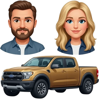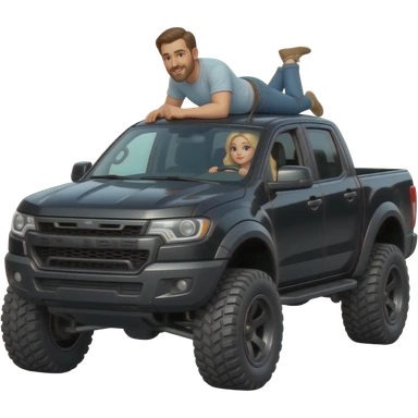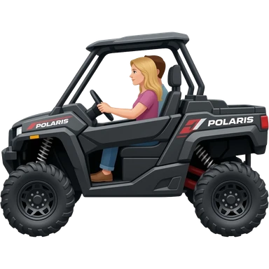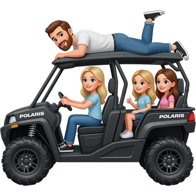 Black side view 4 door Polaris ranger sxs lifted super high with mom (blonde) and driving and dad laying on top of roof on his belly playing emoji | AI Emoji Generator