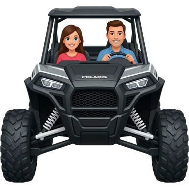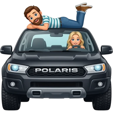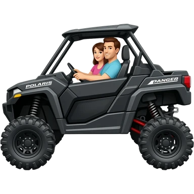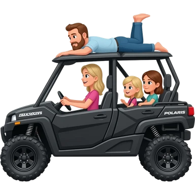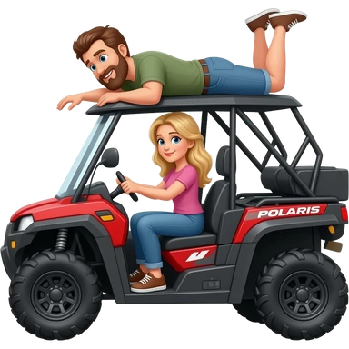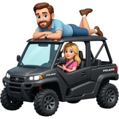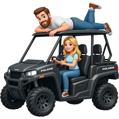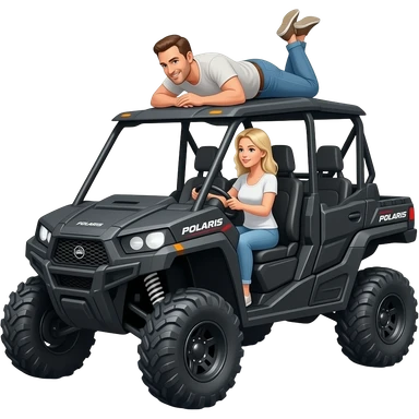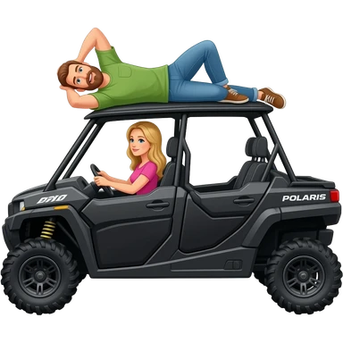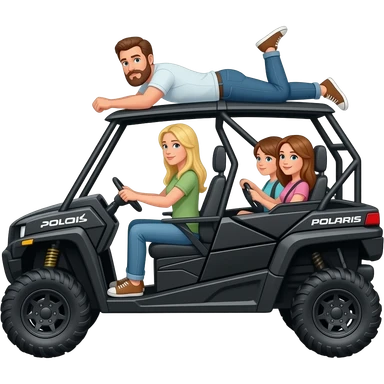 Black 4 door sxs Polaris ranger atv dad with beard laying on top being silly and blonde long hair mom driving emoji
