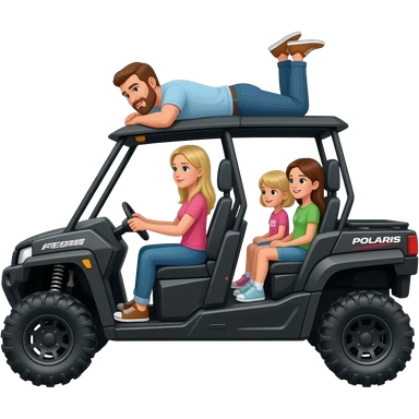 Side view Black 4 door sxs Polaris ranger atv dad with beard laying on top being silly and blonde long hair mom driving and two kids (girls younger is blonde older is brown) in back emoji