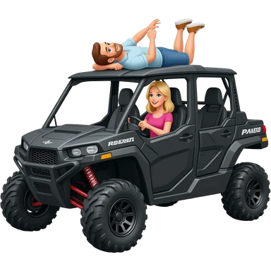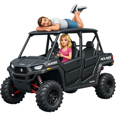 Black 4 door sxs Polaris ranger dad with beard laying on top being silly and blonde long hair mom driving emoji
