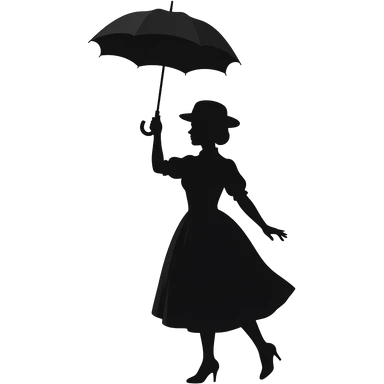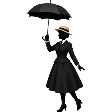 totally black silhouette mary poppins female in straw boater hat, old edwardian dress holding umbrella up high with umbrella hand above head and heels touching each other and feet to pointing out forwards emoji