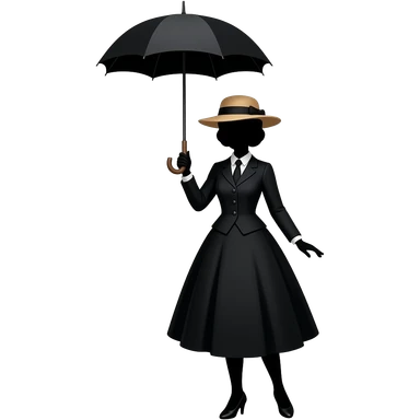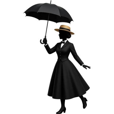 black silhouette mary poppins style female in straw boater hat, old victorian dress holding umbrella up high above head and feet pointing out forwards emoji | AI Emoji Generator