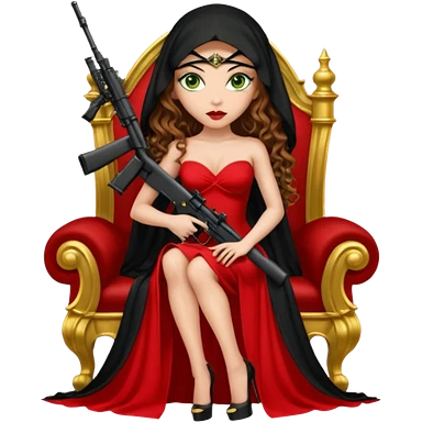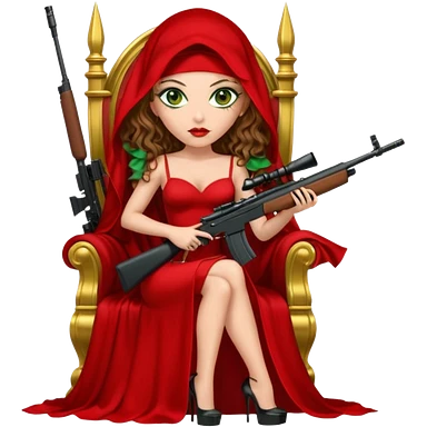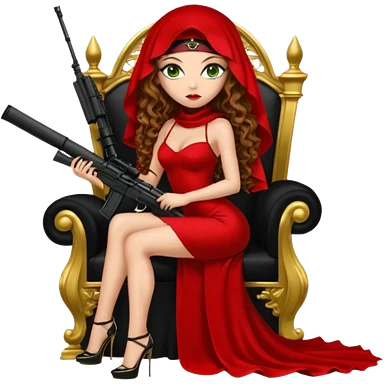 Drug dealer female green eyes symbol. hair is brown curly long hair. sexy long with long red and black dress and mouth veil cover on that covers her mouth and neck only. black stiletto platform high heels shoes on. Holding sniper rifle sitting on a gold throne. emoji