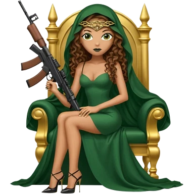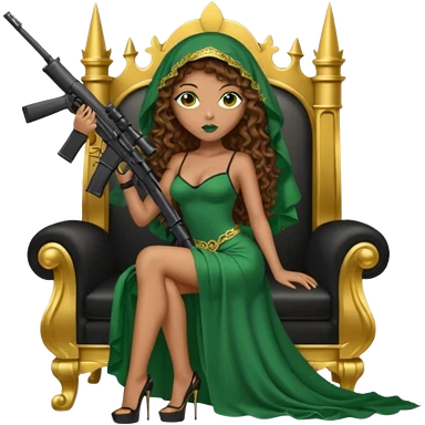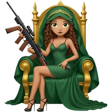 Drug dealer female green eyes symbol. hair is brown curly long hair. sexy long with long dress and face veil on that covers her mouth only. black stiletto platform high heels shoes on. Holding sniper rifle sitting on a gold throne. emoji