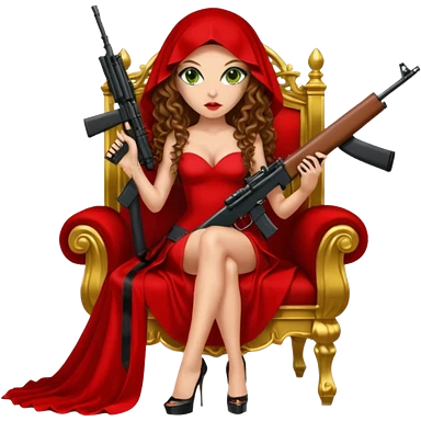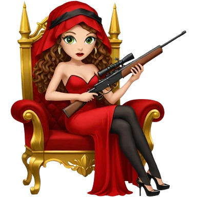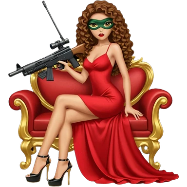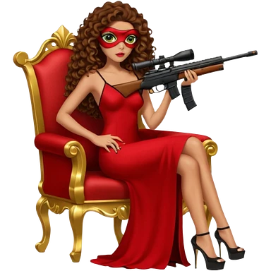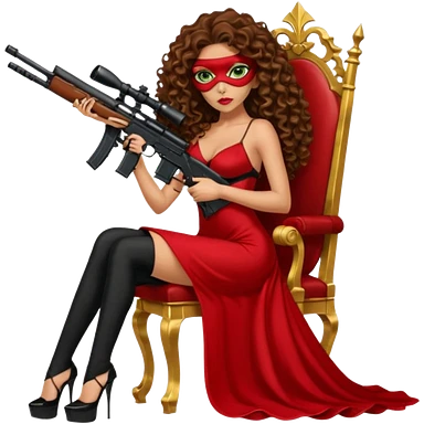 Drug dealer female green eyes symbol. hair is brown curly long hair. sexy long with long red and black dress and face cover on that covers her mouth only. black stiletto platform high heels shoes on. Holding sniper rifle sitting on a gold throne. emoji