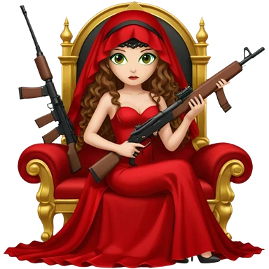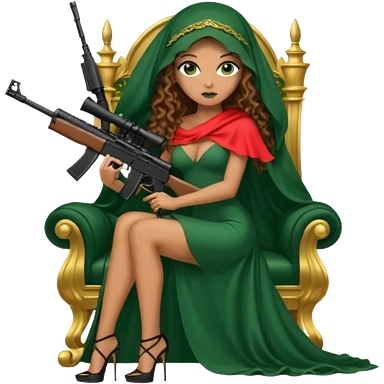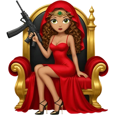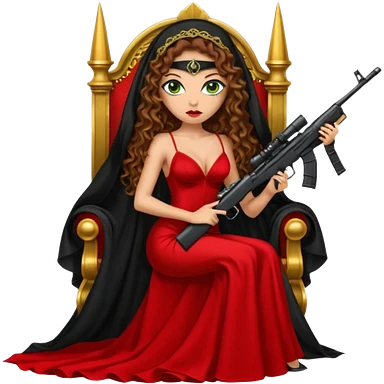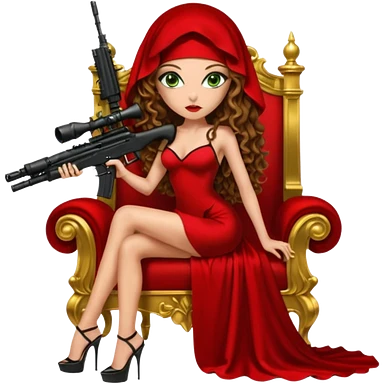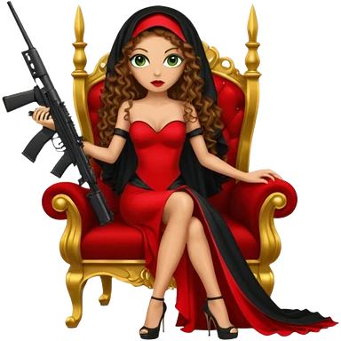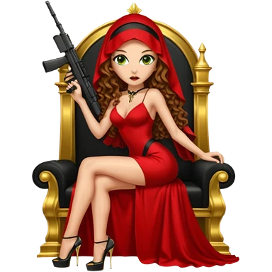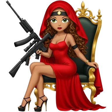 Drug dealer female green eyes symbol. hair is brown curly long hair. sexy long with long red and black dress and mouth veil cover on that covers her mouth only. black stiletto platform high heels shoes on. Holding sniper rifle sitting on a gold throne. emoji