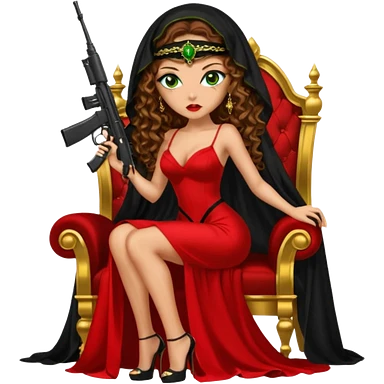 Drug dealer female green eyes symbol. hair is brown curly long hair. sexy long with long red and black dress and face veil on that covers her mouth only. black stiletto platform high heels shoes on. Holding sniper rifle sitting on a gold throne. emoji