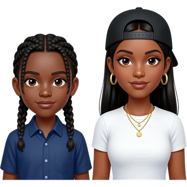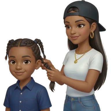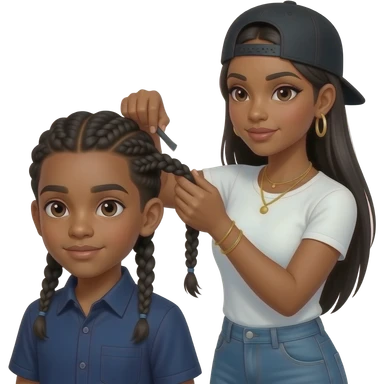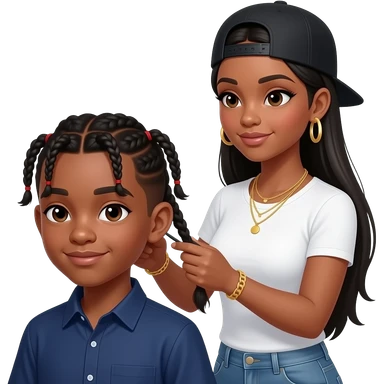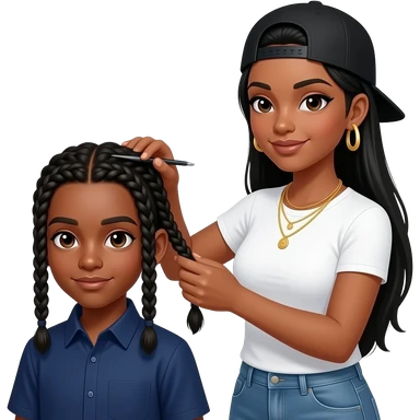 Black teenage boy with two cornrow style braids wearing a navy blue button up shirt getting hair braided by African American woman with long straight black hair wearing a fitted white t shirt wearing a black adjustable cap backwards on head wearing hoop earrings wearing gold tennis necklaces emoji | AI Emoji Generator